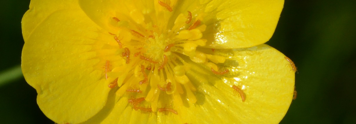 Das Ölkäferweibchen, das wir am 18.April in Heppens am Deich Nähe Mühlenweg beobachtet haben, war dick angeschwollen. Ein paar tausend Eier legt ein Weibchen in die Erde. Im kommenden Frühjahr werden die Larven schlüpfen. Offensichtlich hat ein Schwarzblauer Ölkäfer auch im vergangenen Jahr Eier gelegt. In den Blüten vom Hahnenfuß kann man etwa 2 Millimeter große Tiere entdecken: Es sind die Larven des Schwarzblauen Ölkäfers.