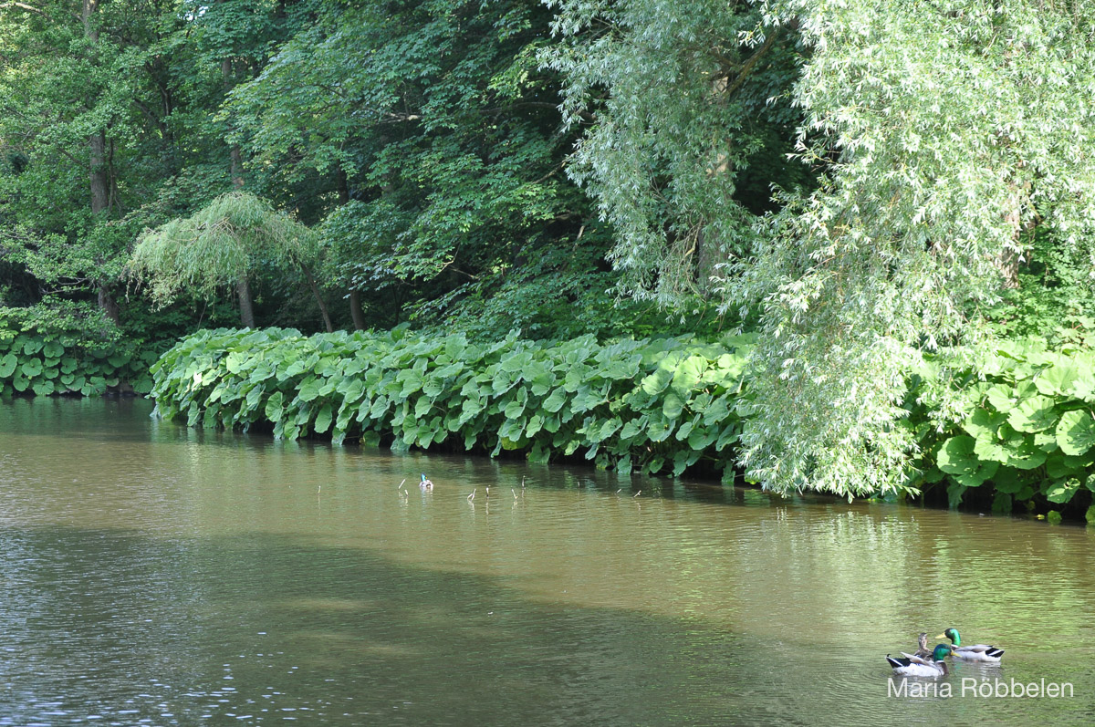 Im Südwesten des Schwanenteiches hat sich Pestwurz angesiedelt. Die lilafarbenen Korbblütenstände erscheinen noch vor den Blättern und sind im zeitigen Frühjahr zu sehen. Im Sommer fallen dagegen die großen, herzförmigen Blätter auf, die an Rhabarber erinnern. In der Bronzezeit sollen sie als „Toilettenpapier“ gedient haben. Ihren Namen hat die Pflanze daher, dass man im Mittelalter glaubte, man könne die Pest damit heilen. Heute wird diese Heilpflanze gegen Krämpfe bei Magen-, Gallen- oder Nierenkoliken verwendet. Die Blätter wirken schleimlösend, schwach harntreibend und wundheilend. Es gibt auch ein Medikament gegen Migräne mit Pestwurzelextrakt. An ihren natürlichen Standorten an Flussläufen wird die Pestwurz häufig durch eingewanderte Pflanzen verdrängt. Japanisches Springkraut und Kanadische Goldrute nehmen immer häufiger ihren Standort ein.