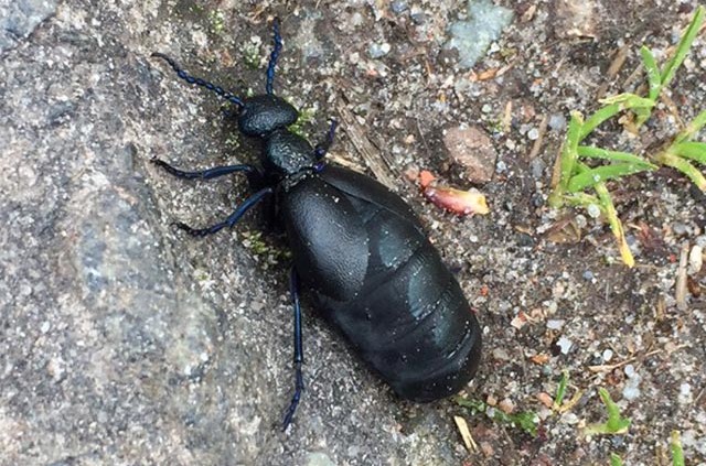 Mit etwas Glück kann man zwischen April und Juni den Schwarzblauen Ölkäfer beobachten. Er wird auch Schwarzer Maiwurm genannt. Der Käfer wird bis zu 3,5 Zentimeter groß. Er ist selten geworden und ist deshalb auf der Roten Liste der bedrohten Tierarten zu finden. Auf dem Foto ist ein Weibchen zu sehen. Bis zu 4.000 Eier lassen den Hinterleib anschwellen. Auch fehlt der deutliche Knick im Fühler, der Männchen auszeichnet.
